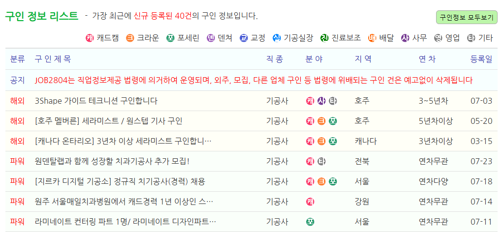 최근에는 경력직뿐 아니라 신입의 진입장벽도 낮아지고 있으며, 서울, 경기, 부산 등 대도시권의 디지털(CAD/CAM) 수요가 급증하고 있습니다. 해외 구인을 원하는 분들에겐 호주, 캐나다 등 글로벌 채용공고도 예정돼 있어 진출 폭이 확대 중이죠.