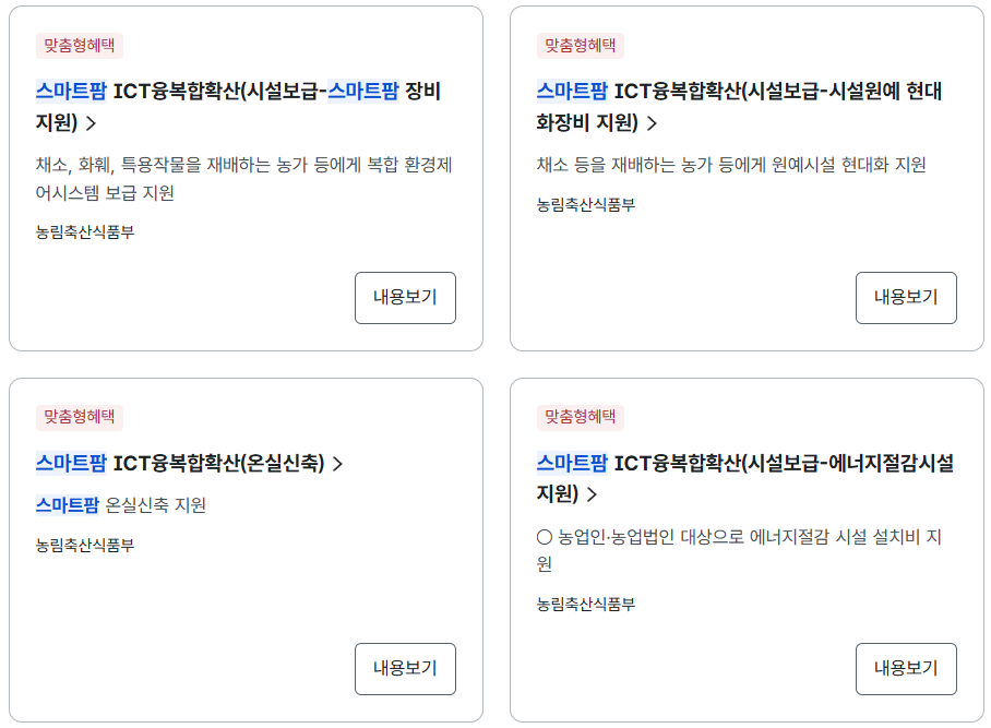 - 스마트팜 ICT융복합 확산사업 : 시설원예, 과수, 축산 분야 스마트팜 시설 및 컨설팅 지원