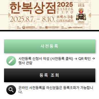 - 사전등록 페이지 이동 : ‘2025 한복상점 사전등록’ 배너를 누르고 신청 페이지로 이동!