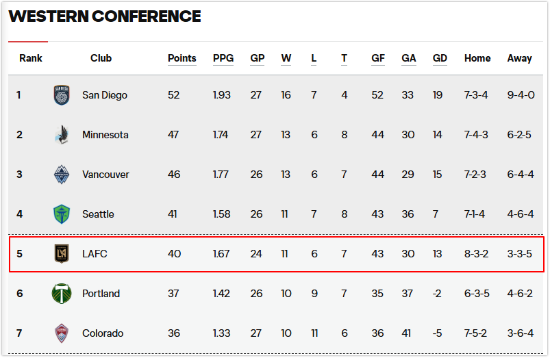 ✅ MLS 리그 순위 및 LAFC 현재 순위